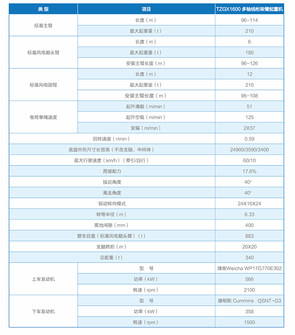 TZGX1600多軸線桁架臂起重機(jī)針對(duì)風(fēng)機(jī)安裝特點(diǎn),上車采用快拆式桁架臂起重機(jī)結(jié)構(gòu),下車采用可自行、可牽引多軸線底盤,整機(jī)最大部件運(yùn)輸寬度小于3.5m,起重能力超強(qiáng),轉(zhuǎn)場(chǎng)高效便捷,可滿足百米級(jí)4.XMW及以上風(fēng)機(jī)吊裝。