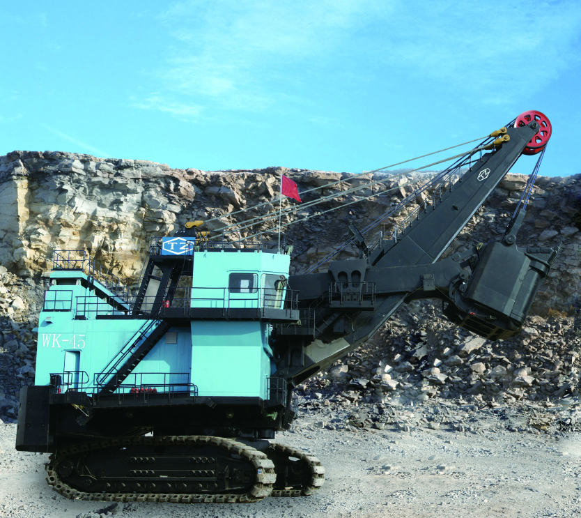 WK-45礦用挖掘機(jī)與220-363t礦用汽車配套使用,也適用于4500t/h-6000t/h自移式破碎站,用于兩千萬噸級及以上大型露天煤礦、鐵礦及有色金屬礦山的剝離和采裝作業(yè)