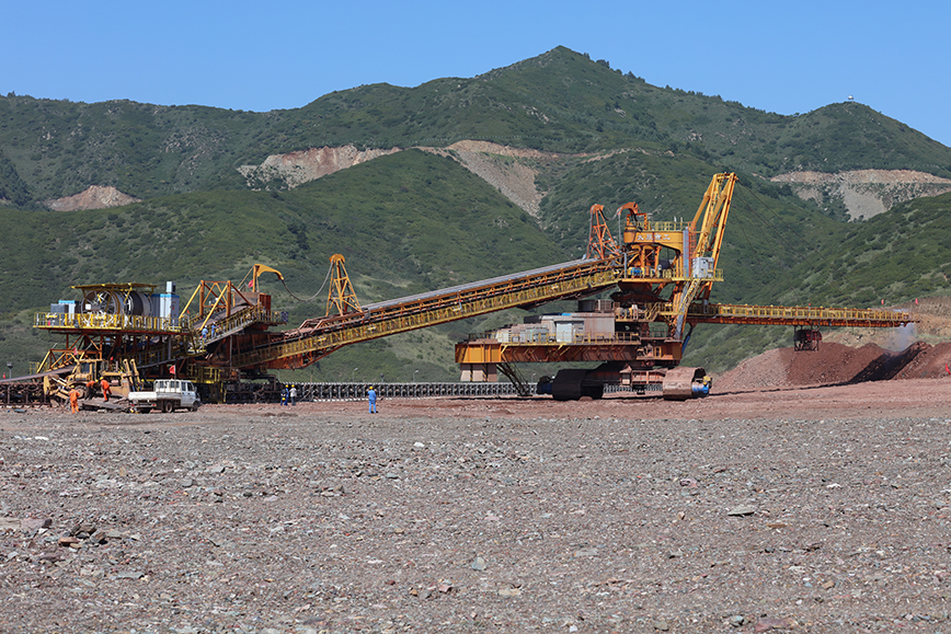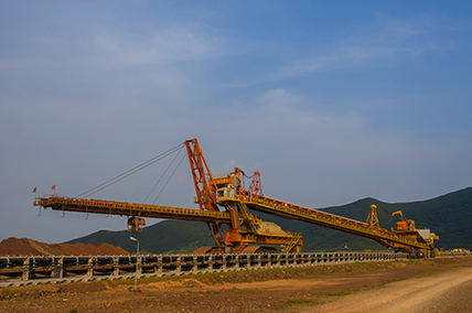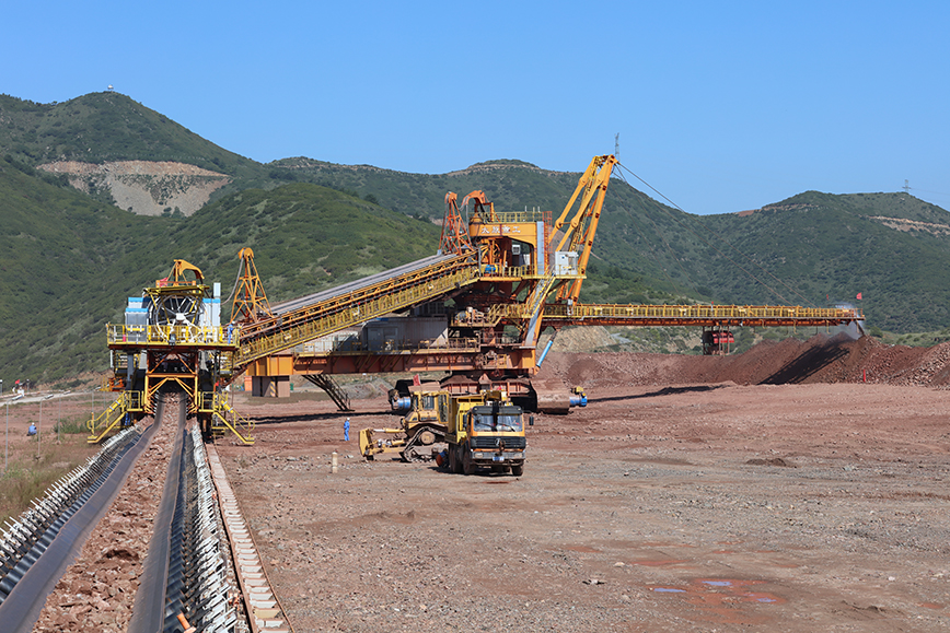排土機(jī)位于大型露天礦山半連續(xù)開(kāi)采系統(tǒng)的末端,用于運(yùn)輸和排棄物料。排土機(jī)與卸料車(chē)協(xié)同工作:卸料車(chē)完成物料的提升,將物料傳送至排土機(jī)的受料皮帶上,排土機(jī)將卸料車(chē)輸送來(lái)的物料通過(guò)排料臂有序排棄至排土場(chǎng);排土機(jī)與卸料車(chē)互鎖聯(lián)動(dòng)完成排土作業(yè)。排土機(jī)按照排土工藝隨排土場(chǎng)的推進(jìn)而移動(dòng)。
