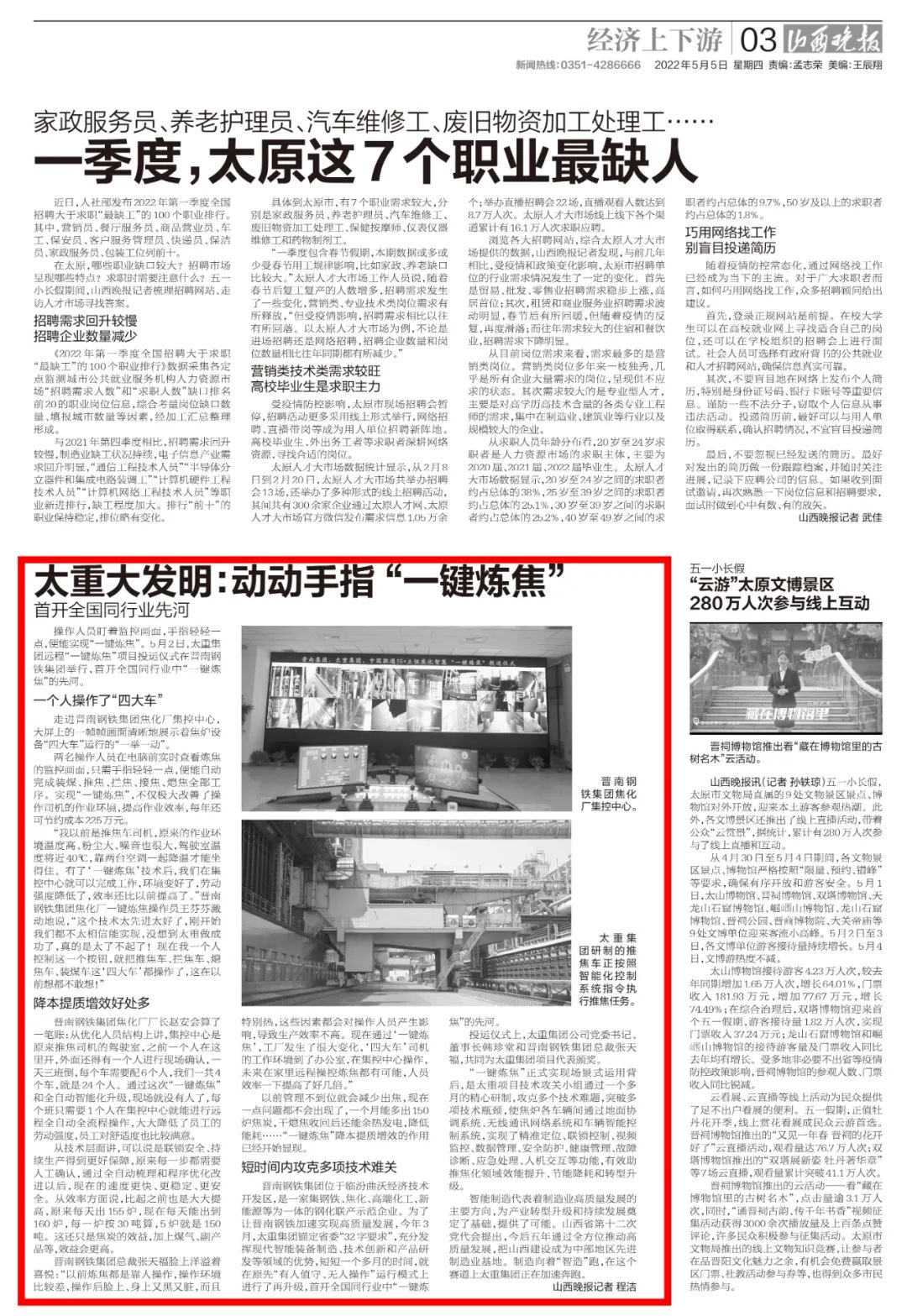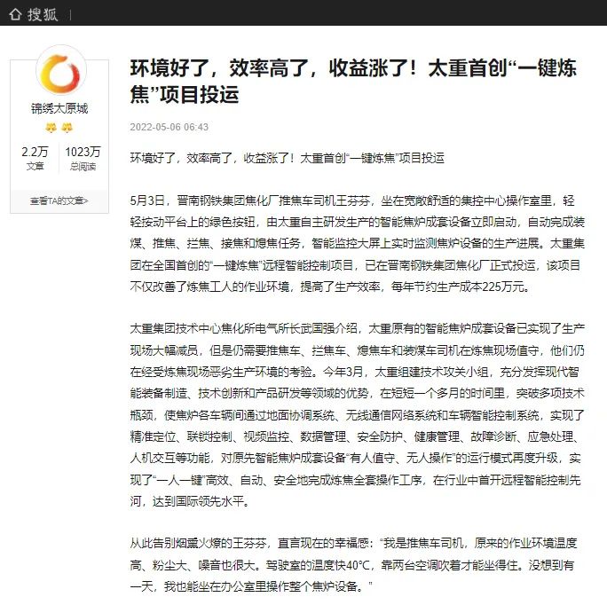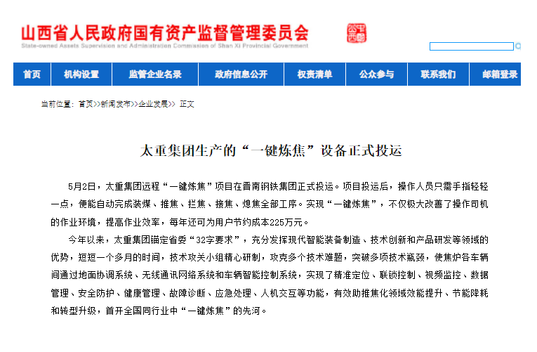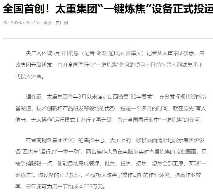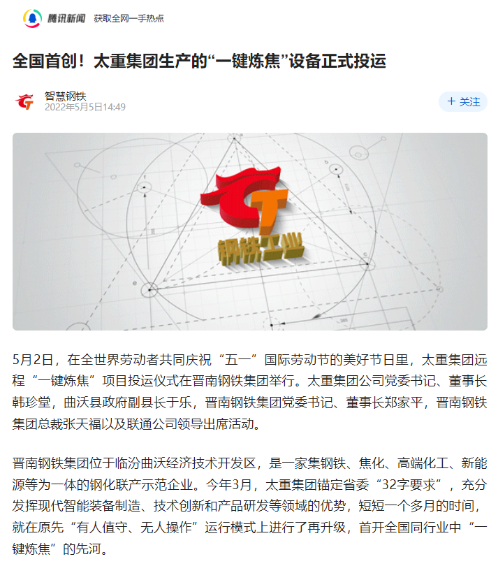 央廣網(wǎng)、中國鋼鐵新聞網(wǎng)、騰訊以《全國首創(chuàng)!太重集團“一鍵煉焦”設(shè)備正式投運》為題,聚焦太重集團以科技創(chuàng)新激發(fā)“智造”新活力為出發(fā)點,全面展示“智能+5G”在“一鍵煉焦”上的應(yīng)用,助力焦化領(lǐng)域效能提升、節(jié)能降耗和轉(zhuǎn)型升級。中國經(jīng)濟網(wǎng)、網(wǎng)易、山西國資以《太重集團“一鍵煉焦”設(shè)備正式投運》為題,報道太重集團“一鍵煉焦”項目正式開啟智能煉焦新時代,填補技術(shù)空白,開創(chuàng)國內(nèi)焦化行業(yè)先河。搜狐網(wǎng)以《環(huán)境好了,效率高了,收益漲了!太重首創(chuàng)“一鍵煉焦”項目投運》為題,重點展示了太重集團“一鍵煉焦”項目成果,實現(xiàn)智能綠色工廠轉(zhuǎn)型再升級。山西日報、山西晚報、太原日報分別以《首開全國同行業(yè)先河!太重“一鍵煉焦”項目投入運行》《太重大發(fā)明:動動手指“一鍵煉焦”》《太重首創(chuàng)“一鍵煉焦”項目投運》為題,聚焦太重“智造”再提速,充分展現(xiàn)公司以“三性五化”為新產(chǎn)品開發(fā)目標(biāo),助力國家實現(xiàn)“雙碳”目標(biāo)。