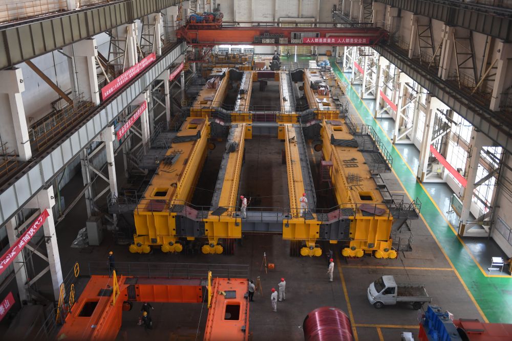 在太重集團起重機分公司車間,550噸鑄造起重機正在進行裝配作業(yè)。