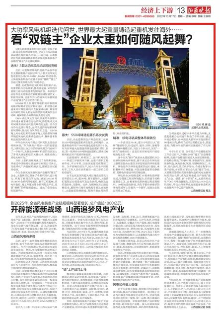 10月17日,山西晚報(bào)刊發(fā)《看“雙鏈主”企業(yè)太重如何隨風(fēng)起舞?》文章,對太重集團(tuán)3款大功率風(fēng)電機(jī)組、550噸鑄造起重機(jī)、核電環(huán)軌梁進(jìn)行報(bào)道。太重集團(tuán)作為我省唯一一家“雙鏈主”企業(yè),深耕智能高端裝備制造和風(fēng)電裝備領(lǐng)域,實(shí)施一系列提質(zhì)、增效、擴(kuò)量的升級改造項(xiàng)目,實(shí)現(xiàn)“設(shè)計(jì)研發(fā)、智能控制、三電總成、整體集成”的發(fā)展格局,集聚產(chǎn)業(yè)鏈優(yōu)勢資源,強(qiáng)化上下游產(chǎn)業(yè)協(xié)同,勇?lián)版溨鳌逼髽I(yè)責(zé)任,推動我省制造業(yè)高質(zhì)量發(fā)展,為轉(zhuǎn)型發(fā)展蹚新路持續(xù)注入強(qiáng)勁動能。