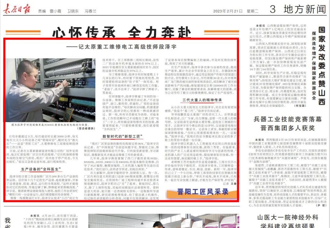 日前,太重集團(tuán)齒輪傳動(dòng)分公司電工段澤宇榮獲了太原市第四屆“晉陽(yáng)工匠”榮譽(yù)稱號(hào)。《太原日?qǐng)?bào)》于日前對(duì)其事跡進(jìn)行了宣傳報(bào)道。