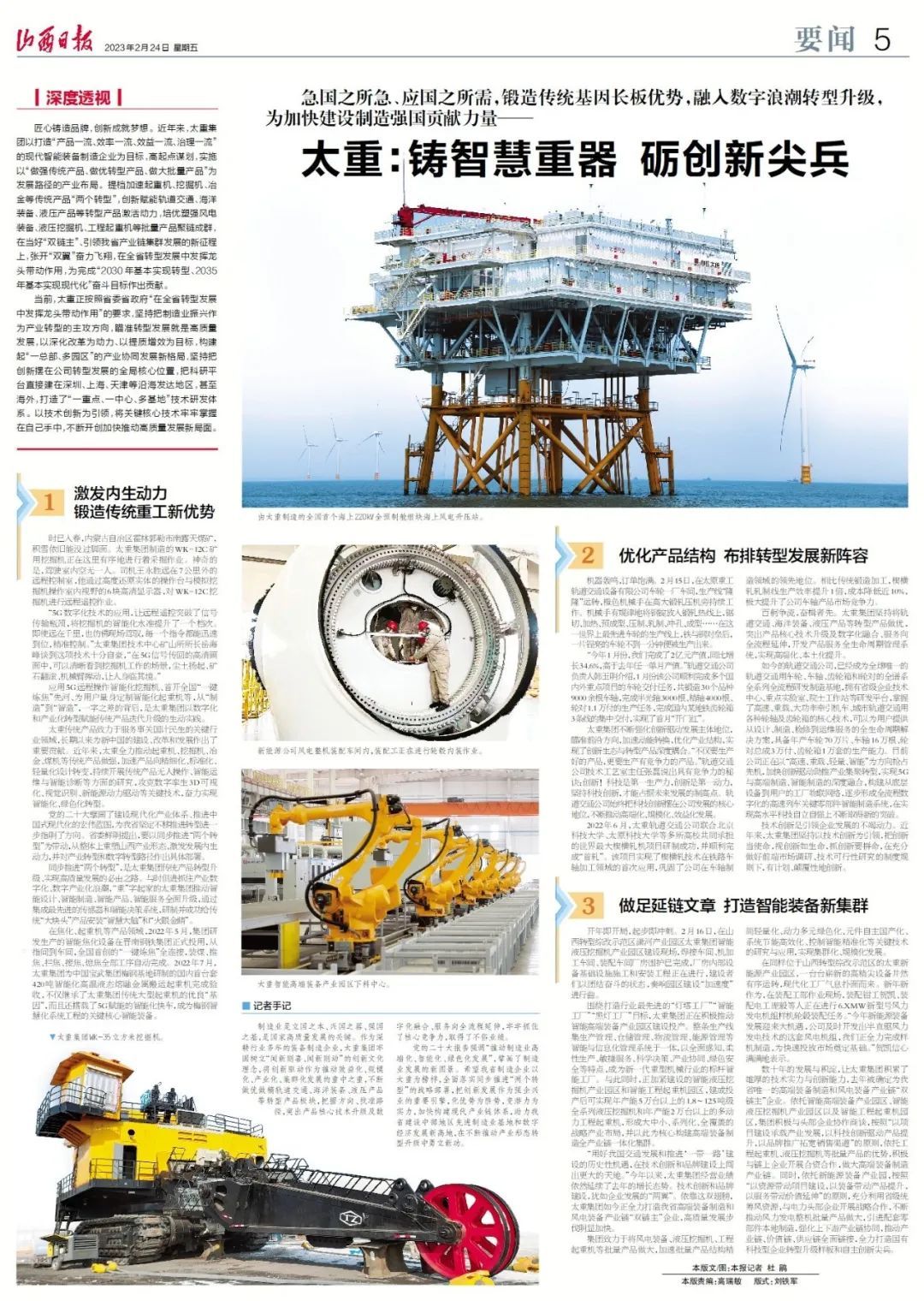 今日,山西日?qǐng)?bào)整版刊發(fā)《太重:鑄智慧重器 礪創(chuàng)新尖兵》文章,深入報(bào)道了太重集團(tuán)深耕智能制造,厚植創(chuàng)新發(fā)展的生動(dòng)實(shí)踐。作為全省唯一“雙鏈主”企業(yè),太重集團(tuán)以科技創(chuàng)新賦能轉(zhuǎn)型發(fā)展,探索科技創(chuàng)新和高端裝備制造產(chǎn)業(yè)深度融合的發(fā)展道路,為推動(dòng)中國(guó)“智”造、建設(shè)制造強(qiáng)國(guó)做貢獻(xiàn)。