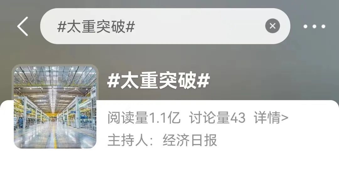 當天,由經(jīng)濟日報發(fā)起的微博話題#太重突破#,引發(fā)讀者強烈共鳴,閱讀量一路激增,達到1.1億+!