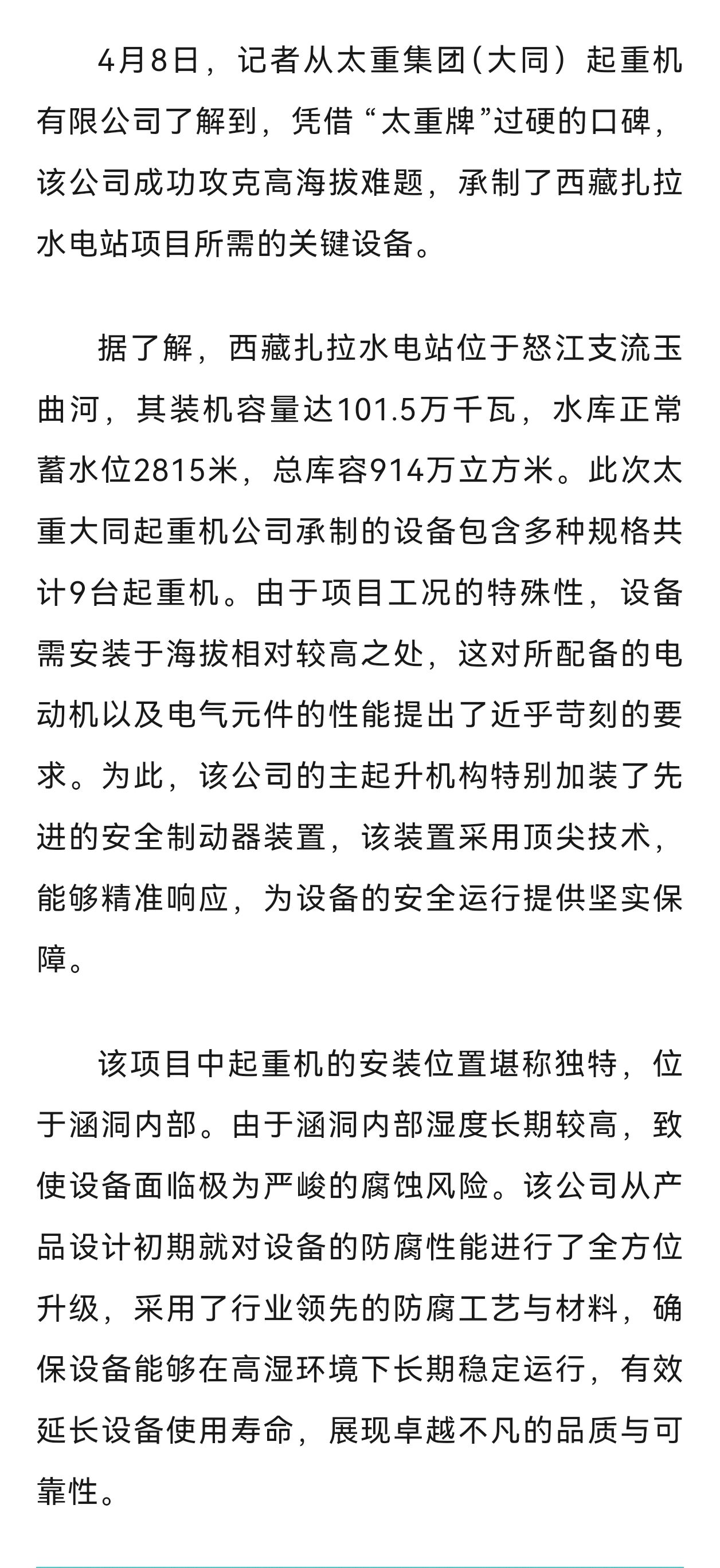 喜訊傳來,振奮人心!太重集團(大同)起重機有限公司佳績不斷,再獲矚目。此前助力攀枝花項目,憑借出色表現(xiàn)受到媒體關注。4月9日,《大同日報》頭版再度聚焦報道,太重集團(大同)起重機有限公司攻克高海拔難題,成功承制了西藏扎拉水電站項目關鍵設備承制任務。